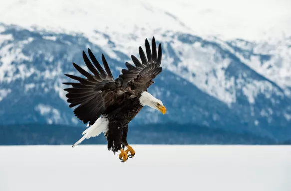 Don’t forget to look up to the sky if you want to spot the national bird symbol of the United States. Alaska is home to the bald eagle – which actually has a snowy-feathered head.