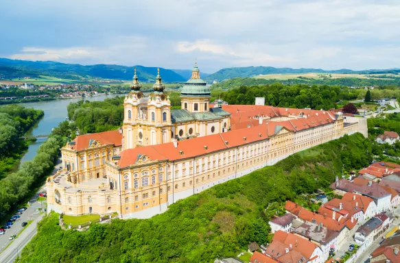 Next up on a typical Danube cruise itinerary is the resplendent Melk Abbey, an enormous honey-coloured castle that is home to monks of the Benedictine Order. Situated on a rock overlooking the river Danube, the abbey is famous for its splendid architecture, library and decorative frescoes, as well as its 195-metre-long gallery lined with portraits of emperors.