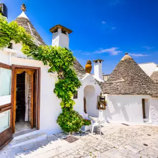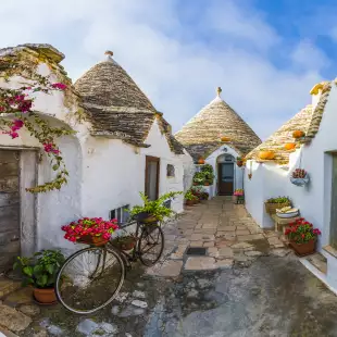 Inland, you'll find the Itria Valley, characterized by rolling olive groves and, beautiful white-washed villages like Ostuni, known as the "white city" for its dazzlingly white buildings. In towns like Alberobello, you'll find the UNESCO-recognised trulli - white, cone-roofed stone houses that look like something out of a fairy tale. These structures are interwoven with the fabric of the community and are used as shops, cafes and homes.