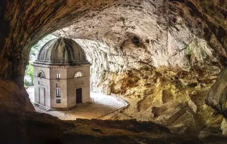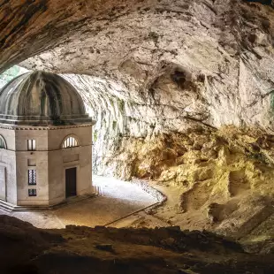 It is known for its diverse landscapes, including beautiful beaches of the Adriatic, rolling hills, and towering peaks of the Umbria-Marche Apennines and the Sibillini Mountains. While the cities and sights here are not well known, there's one sight here that should not be missed: The Frasassi Caves. Discovered in 1971, this massive cave system is home to breathtaking stalagmites and stalactites. Located at the entrance of the Frasassi Caves is the Temple of Valadier a nineteenth-century domed marble temple, a pilgrimage site for absolution.