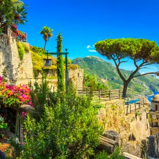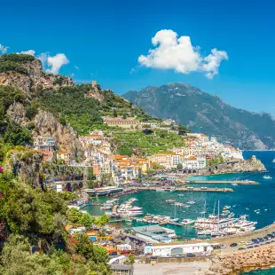 The Amalfi Coast is a captivating destination famous for its dramatic cliffs and colourful villages. It offers a paradise where the pastel-coloured houses of Positano and the luxury boutiques engage the senses and inspire the spirit. Along its shores, you can explore Amalfi, a historic town featuring a stunning cathedral and vibrant piazzas; Ravello, known for its breathtaking gardens and villas, such as Villa Cimbrone and Villa Rufolo; and Furore Fjord, a hidden beach nestled between steep cliffs, which provides a perfect spot for a peaceful escape. And just off the coast picturesque islands like Capri, Ischia and Procida, each with their own unique atmosphere.