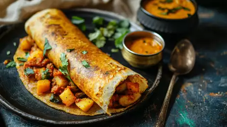 Originating from South India, masala dosa is a crispy, golden rice crepe filled with a spiced potato mixture. Served with coconut chutney and tangy sambar (Lentil-based vegetable stew), it’s a beloved breakfast dish that’s light yet filling.