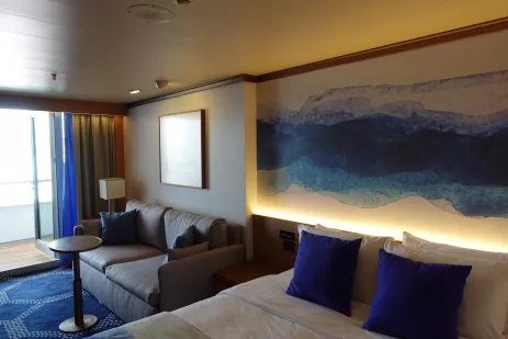 On our Celestyal cruises, you can upgrade your suite to a junior balcony suite, giving you more room inside and (as the name suggests) a spacious balcony. I took a look inside and was instantly a little jealous. With floor-to-ceiling windows, a jet tub bath and shower, and a sofa to relax on during the day, it's well worth the upgrade if you plan to spend time in your room (or if you want to enjoy those sea views privately).