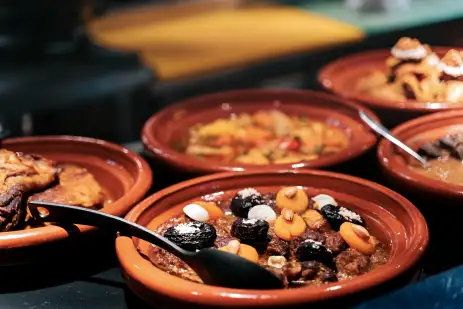 A city scented with saffron, mint and slow-cooked spice, Marrakesh is a feast for the senses. Its souks, street stalls and riad restaurants celebrate generations of culinary craft. Start your meal with a comforting harira, Morocco’s beloved lentil and chickpea soup, popular during Ramadan but thankfully served year-round. Then tuck into a tagine barkok, an aromatic dish of tender beef with sweet prunes and eggs, slowly cooked to perfection in an earthenware pot.