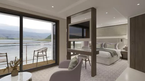 And now, for 2025, we're introducing Grand Suites - a whopping 32 square metres on our new MS Riviera Radiance - making our river cruise cabins and suites among the largest on any river cruise vessel. It includes a separate living space and a private full balcony with outdoor seating - it's the perfect place for breakfast al fresco or a pre-dinner sundown cocktail while looking out over the magnificent Danube river.