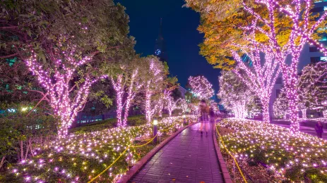 - Lanterns adorn buildings, bridges and streets across the city, particularly Minato Park
