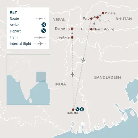 Step into a world of contrasts on this unique journey through Eastern India and Bhutan. Begin in Kolkata, where the legacy of British India and colourful street life combine to create a feast for the senses. Then enjoy a taste of Himalayan charm, as we ascend to Darjeeling, visiting tea estates and riding on the UNESCO-listed Toy Train. Crossing into Bhutan, we discover a land of sacred monasteries, fluttering prayer flags, and dramatic mountain landscapes — from the cliffside Tiger’s Nest to the serene dzongs of Thimphu and Punakha.