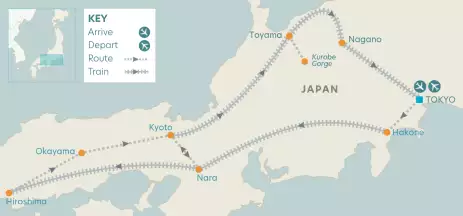 - Discover some of Japan's most breathtaking vistas with visits to the lakes around Mount Fuji and scenic journeys along the Kurobe Alpine Route and the Kurobe Gorge Railway.