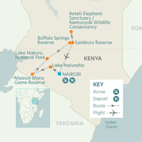 *Please note: There is a 45 minute domestic flight from Samburu to Nairobi. There will be lunch or dinner served (depending on your domestic flight time) before a 30 minute transfer to the final departure airport.