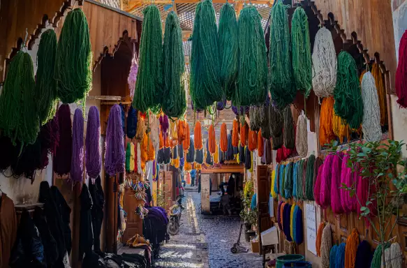 As we wander through its labyrinthine alleys, we’ll uncover the legacy of Fez as a medieval powerhouse of learning and faith — home to revered Islamic and Jewish institutions, historic libraries, and majestic mosques. The souks are divided into specialised quarters, each brimming with life: from the rhythmic clang of copper being shaped, to the fragrant stalls of herbs and spices, and the vivid dye pits that have operated for centuries.