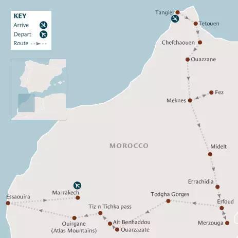 Upon landing, we’ll transfer to the hotel, where you can settle in and unwind after your journey. After check-in, take some time to relax or soak up the first impressions of this storied port city, perched between the Mediterranean and Atlantic. In the evening, enjoy a welcome dinner and your first overnight stay in Tangier.