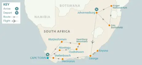 Explore 'a world in one country' on a journey from Johannesburg to Cape Town. Travelling through national parks, verdant wine valleys, mountainous landscapes and along Route 62 with stays in South Africa’s biggest cities.