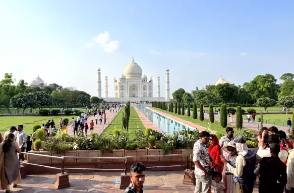 The tour continues with a visit to the red sandstone Agra Fort. Completed in 1573, it was the headquarters of the Mughal Empire, boasting vast size and opulence; its buildings make it more of a walled palace than a fort.