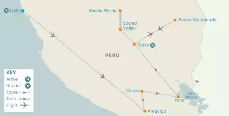 Included excursions are guided visits to the Colca Canyon, Sacred Valley, Pisac Market, guided tour of Arequipa, Machu Picchu, Cusco, Taquile and Uros Islands on Lake Titicaca