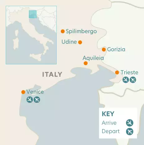 Discover a less-explored side of Italy: a grand Hasburg city, a Venetian pearl without the crowds, ancient Roman ruins, a fairy-tale castle by the sea, and Friulian specialties.