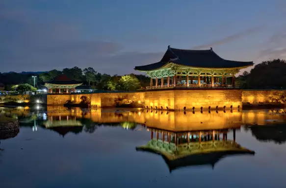 Tonight, we'll see some of the city's sights lit up against the night sky. Our first stop is Donggung Palace and Wolji Pond. Built to commemorate the victory of Silla, and later used as the recreational area for the Silla's royal family, many locals visit in the evening to see the traditional structure lit up. The lights really give it an almost magical quality. Carrying on, we'll also see the Woljeonggyo Bridge. Built during the Unified Silla period, the original bridge was burned down during the Joseon dynasty. In 2018, after years of research, the bridge was rebuilt and has become the largest wooden bridge in Korea. At night the bright yellow lights reflect in the water - it's a postcard-worthy sight so you'll want to have your camera in hand!