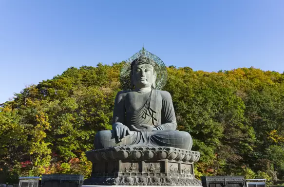 Soon after we enter, we'll see The Great Bronze Buddha, a 14-meter-tall gilt bronze statue a short walk away from the Sinheungsa Temple, that is believed to be the oldest Zen temple in Korea.