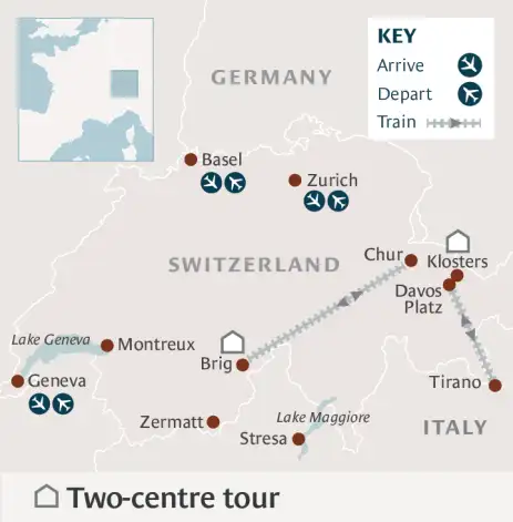 - Visit Montreux on the shores of Lake Geneva, known as the ‘Swiss Riviera’, and Italy's fabulous Lake Maggiore and the delightful town of Stresa.