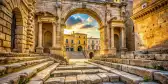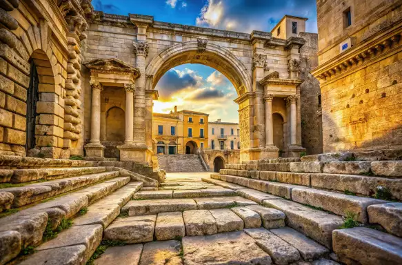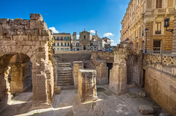 Our tour kicks off at the grand Porta Napoli, where we meet our local expert guide in a small group of your fellow travelling companions to explore this captivating city. From there, we delve into the bustling Jewish quarter and marvel at the Basilica di Santa Croce. This impressive Baroque masterpiece boasts an elaborate façade filled with intricate details in its stone carvings, drawing you in for a closer look. As we wander through the historic Old Town, we take a moment to appreciate a bank with a fascinating past—it was once a storage site for olive oil rather than currency. A visit to the alluring Piazza Sant’Oronzo reveals another gem: the remains of a Roman amphitheatre from the 2nd century, where over 25,000 spectators once enjoyed various performances. The sight of the well-preserved stone seating evokes the lively, bloodthirsty crowds that filled the space centuries ago. Continuing our journey, we stroll down lively streets lined with shops to reach the grand Piazza Duomo. Here, the cathedral, constructed in 1144, stands majestically. Its striking façade is rivalled only by the interior that boasts twelve side chapels adorned with works from various renowned artists.