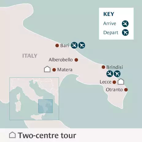 Explore Matera on a guided tour, enjoy an aperitivo on a rooftop terrace and spend the rest of the day at leisure.