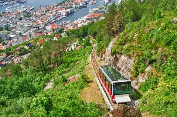 This afternoon, we'll take a scenic ride on the Fløibanen funicular, which starts from the centre of Bergen and reaches the summit of Mount Fløyen. At the top, there's time to soak up spectacular panoramic views over the city and follow a walking trail leading to one of the many viewpoints overlooking the magical landscape of fjords, lush green forests and mountain peaks.