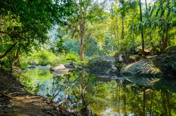 Nestled southwest of Chiang Mai, Maewang National Park welcomes you with a gentle embrace of nature’s quiet charm. As you arrive, the air shifts to the earthy scent of forest trails. In our small group, we begin with a soft trekking experience, winding through leafy paths, each step revealing the wild terrain and serene wilderness that make this park a hidden gem.