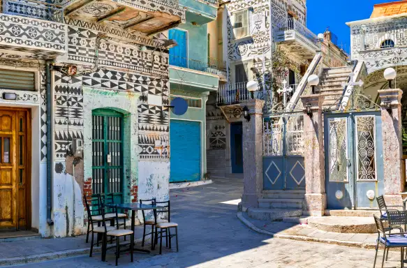 Our included tour will visit Pyrgi, a village unique in Greece, as all the houses are intricately decorated in a geometric ‘sgraffito’ style. Continue to visit the Mastic trees where you can discover how this unique traditional product is produced, harvested and used. Our final stop will be the village of Mesta with its labyrinthine vaulted streets – an amazingly well-preserved living medieval village.