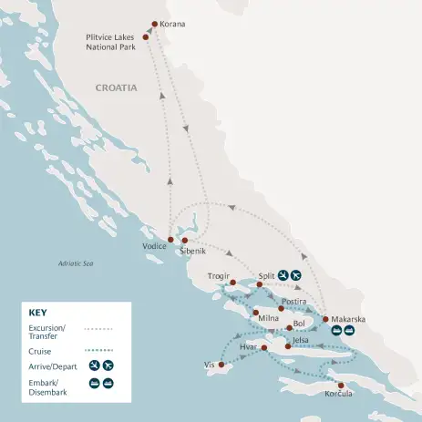 Sail between the Dalmatian coast and its islands on our epic Adriatic adventure, combining historic seaside destinations, like Roman Split and medieval Korčula, with the beauty of Croatia's Plitvice Lakes.
