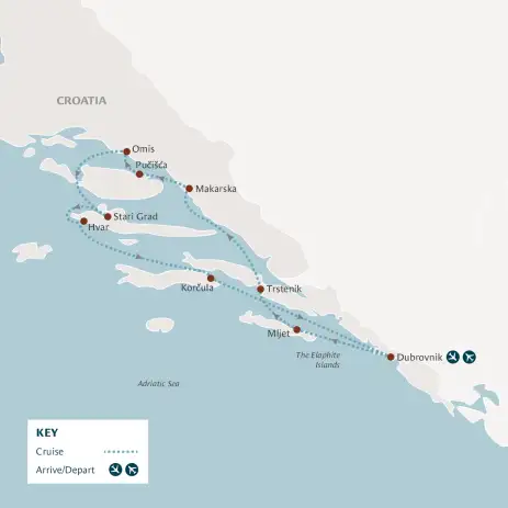 Start in Dubrovnik, the "Pearl of the Adriatic," and sail to idyllic islands, historic towns, and hidden coves. Swim in crystal-clear waters, explore UNESCO-listed gems like Stari Grad, and wander through charming medieval streets in Korčula and Hvar. Along the way, savour local wines in Trstenik, marvel at Makarska's dramatic landscapes and dive into the rich cultural heritage of Croatia’s coastal treasures.