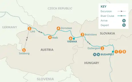 - Enjoy magnificent performances on board - a string quartet and a traditional Hungarian folklore show as well as classical music performances in Bratislava and Salzburg.