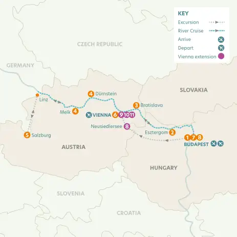 After seven nights cruising along the Danube river and exploring historic destinations - including some of Europe's cultural highlights in Budapest, Esztergom, Bratislava, Dürnstein, Melk, Linz, Salzburg and Vienna - end this spectacular adventure with a three-night stay in central Vienna. During our time on shore, we'll discover the natural beauty and history of Neusiedlersee, as well as its fascinating birdlife. And explore Schönbrunn Palace on a tour, following in the footsteps of Emperors through the imperial apartments. We look behind the scenes of the State Opera and experience a traditional Heurigen evening. You can even choose to experience a concert at the Haus der Industrie, before saying goodbye to one of Europe's most opulent cities.