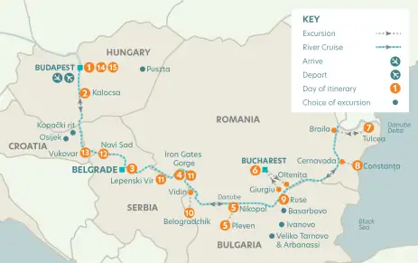 On our cruise through the Balkans, we start by exploring the sights of Kalocsa and Belgrade, with its magnificent Kalemegdan Fortress. Then it’s off to Pleven passing through the Iron Gates Gorge and the Djerdap locks before visiting Bucharest, the capital of Romania. Known as ‘Little Paris,’ this gem of a capital city will capture your heart with its romantic buildings and boulevards. Then we explore the very best of The Danube Delta and enjoy a cruise through Europe’s largest area of wetlands – a UNESCO-listed site. We visit Constanța on the Black Sea coast, where you can explore its charming Old Town. From Ruse, either explore Veliko Tarnovo, the village of Arbanasi and the rock hewn churches at Ivanovo, or Ruse and the churches at Ivanovo and Basarbovo. From Vidin we take a scenic drive to the rock formations at Belogradchik, then we visit Lepenski Vir – one of the most important Mesolithic archaeological sites in Serbia and marvel at the views from Kapetan Mišin breg. Entering Croatia, you can choose to see Osijek & Vukovar, or take a boat ride in the Kopački rit nature park nestled between the Danube and Drava rivers.