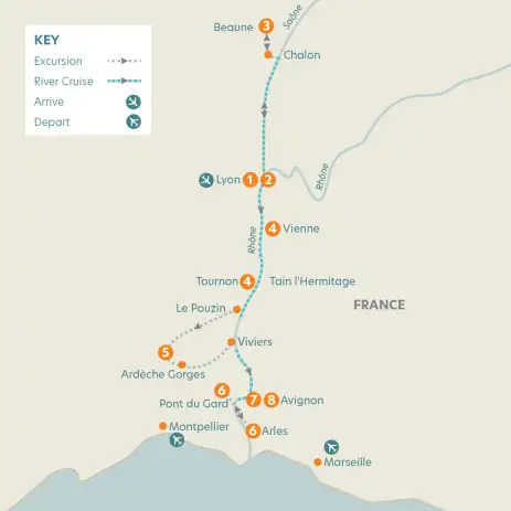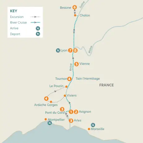 Our journey through France explores the beautiful Saône and Rhône French rivers, the preferred route of traders and invaders alike since the dawn of recorded history. Everywhere there are reminders of the Romans and the greatest empire of the ancient world. There are guided tours to Lyon and Beaune, with a visit to the Hôtel-Dieu. We’ll explore Vienne and taste the wines of the Rhône Valley at Tain l’Hermitage. You will be staggered by the engineering genius of the amphitheatre at Arles and the huge aqueduct at the Pont du Gard. Avignon was the seat of the Papacy during medieval times, heralding a century of greatness crowned by the absorbing Papal Palace and its renaissance art collection.