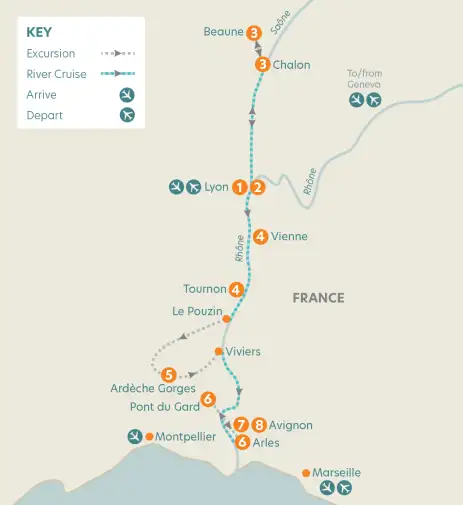 Our journey through France explores the unrivalled natural beauty of the Rhône river as it runs its course through sun-soaked landscapes from Lyon to Avignon. We'll step ashore to explore a beautifully restored historic garden and discover the gorgeous vistas and charming parks that inspired the artistic genius of Van Gogh. And wander through Lyon, Vienne and Beaune with an expert local guide. As we pass verdant terraced vineyards, enjoy the beautiful fragrance of Provençal lavender and gaze in awe at the stunning Ardèche Gorge and its remarkable suspended gardens - all accompanied by a glass or two of Burgundy's finest wine.