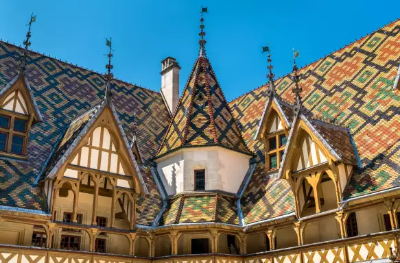 Nearby is medieval Beaune, Burgundy’s wine capital, which is wonderful to wander around. At its centre is the Hospices de Beaune, also known as the Hôtel-Dieu. Originally built in the 15th century as a hospital for the disadvantaged, it’s a jewel of High Gothic architecture, instantly recognisable for its colourful glazed roof tiles arranged in dazzling geometric patterns.