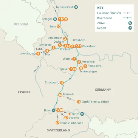 - Explore some of Europe’s most interesting cities, including Strasbourg, Koblenz, Speyer, Rüdesheim, Cologne, Trier, Luxembourg City, Cochem, Worms, Breisach, Lucerne, Andernach and Bonn.