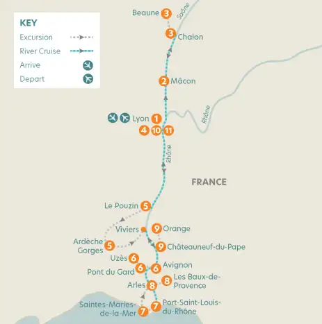 - Discover your destinations on eight guided tours including Cluny Abbey, Beaune, Lyon, Avignon, Uzès, Arles, Orange and Saintes-Maries-de-la-Mer.