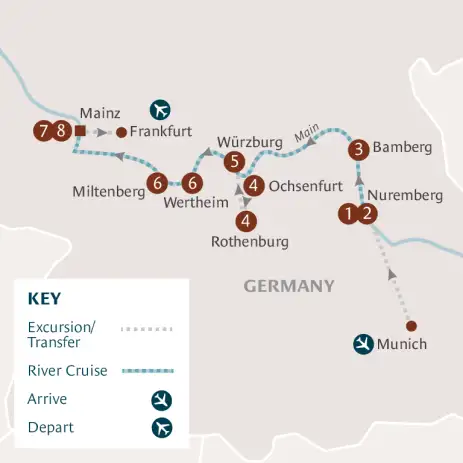 Explore Medieval Germany in its purest form, cruise the Main and the Main-Danube-canal discovering the Romantic Road, the streets of medieval Bamberg, enchanting Rothenburg and fascinating Nuremberg.