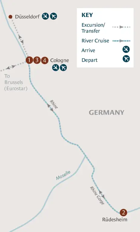 Arrive in Cologne, Dusseldorf or Brussels and transfer to our ship moored in the heart of Cologne, one of Germany's oldest cities. The friendly, English-speaking crew will welcome you and help you to your cabin. After time settling into your spacious accommodation, it's time to familiarise yourself with the many first-class aspects of this floating boutique hotel.