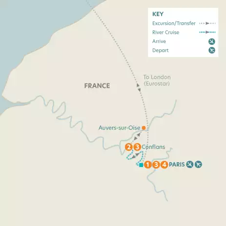 Experience life on the River Seine during a scenic river cruise. Visit Auvers-sur-Oise, a town that inspired famous artists and Paris, France's iconic capital city.