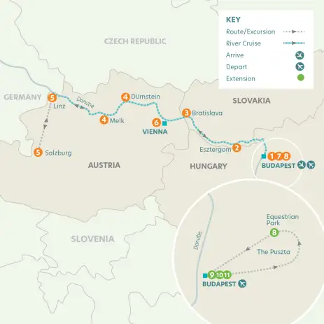 After seven nights cruising along the Danube river and exploring historic destinations - including some of Europe's cultural highlights in Budapest, Esztergom, Bratislava, Dürnstein, Melk, Linz, Salzburg and Vienna - you can discover more of majestic Budapest’s imperial past and the 19th-century grandeur of the Habsburg Empire. Delve into the charming, old-world atmosphere of medieval Buda, stroll along the broad boulevards of elegant Pest and venture into the scenic Puszta, Hungary’s Great Plain, on this superb three night extension.