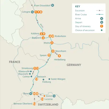 - Explore some of Europe’s most interesting towns and cities, including guided tours of Strasbourg, Heidelberg, Cologne, Rüdesheim, Boppard, Mainz, Speyer, Koblenz, and visits to Colmar and Breisach.