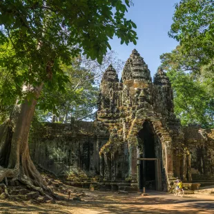 We’ll visit the huge, fortified 13th-century city of Angkor Thom with its five monumental gates and 91-metre-wide moat; its centre contains one of Angkor’s most astonishing sites, the temple of Bayon. Crowned by over 50 towers, each with four colossal carved heads looking out in every direction, this is an extraordinary masterpiece of Khmer art.