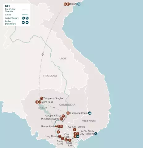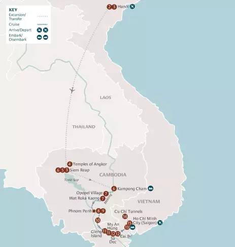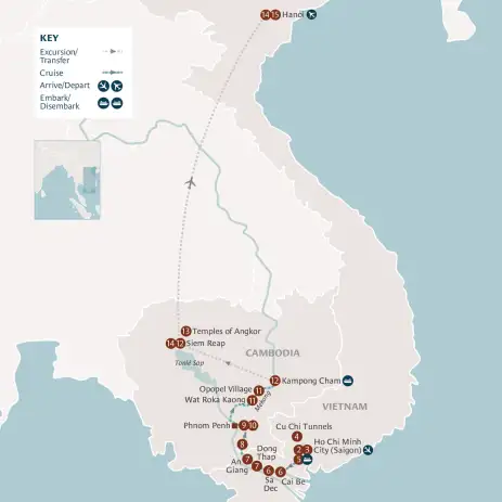 This evening, celebrate your journey with a farewell gathering hosted by the ship’s crew, followed by a special Cambodian dinner to mark the end of your adventure.