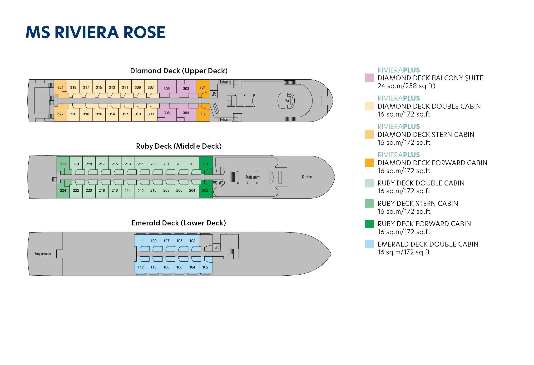 MS Riviera Rose is a beautifully crafted ship with cabins and amenities spread over four decks. This brand-new, state-of-the-art ship has been built in collaboration with our long-standing shipping partners to provide a first-class service to each and every guest. Whether you are relaxing on the Sun Deck, enjoying a drink with your fellow travellers in the bar or curling up for a good night's sleep in your spacious and well-furnished cabin, everything has been meticulously designed for your comfort.