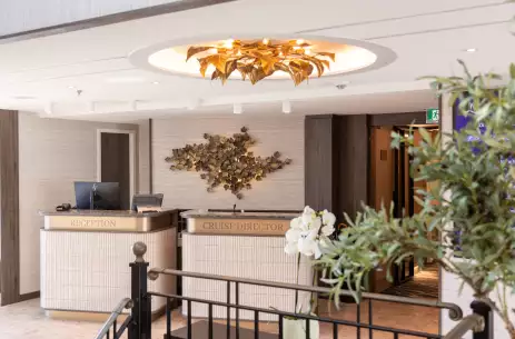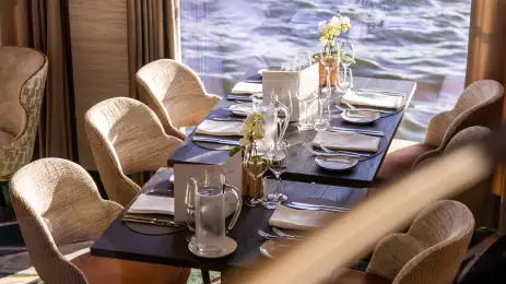 On the Diamond Deck, you'll find our Balcony Suites as well as some standard cabins. It is also home to the reception area and the social hub of the ship, the bar. Here, you and your fellow explorers can gather over drinks to discuss the highlights of the day after dinner, accompanied by the soothing tones of the ship's pianist. During the day, you can sink into its sumptuously soft armchairs and sofas with a freshly made cup of tea and watch the ever-changing landscapes and charming towns and villages drift by.