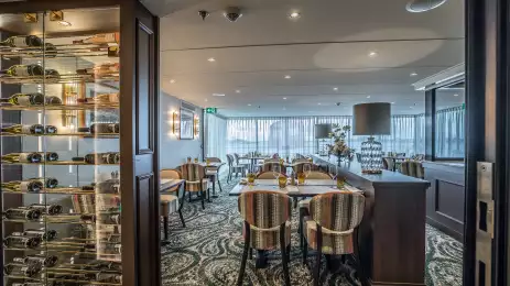 The Diamond Deck is where you will find the very heart of the ship - the superb panoramic observation lounge and bar; a lounge in every sense of the word, complete with plenty of comfortable leather armchairs and sumptuous sofas where you can sink into warmly colourful cushions in beautiful quality fabrics with a freshly made cup of tea. A thick wool carpet feels lovely underfoot and the tasteful contemporary lighting above creates a welcoming and refined ambience, further complemented by the discreet and intuitive service resplendent of the finest five-star hotels. So just sit back with your favourite cocktail and take in the truly mesmerising view. After a superb dinner in the restaurant perhaps it’s time for a digestif accompanied by the soothing tones of the ship’s pianist. At the Riverview Kitchen with its large panoramic windows, enjoy a more intimate dining experience whilst taking in the fantastic views. Here in the evenings the chef presents in the open kitchen a selection of locally inspired dishes which you can enjoy with your fellow guests; this intimate dining experience can be reserved on board at no extra charge. When the weather allows the panoramic windows may be fully opened on to the terrace to allow a delightful al fresco dining experience.