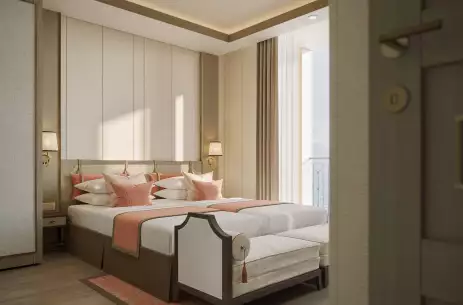 The Vista Suite features a French-style balcony, comfortable seating area, and a well-appointed bathroom. High ceilings and elegant décor create a peaceful retreat after a day of exploration.