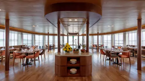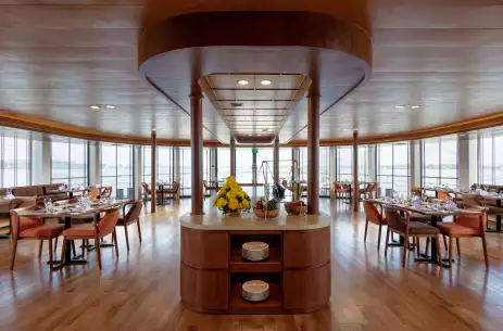 The entire Panorama deck features floor-to-ceiling windows for incredible views of the river as we sail. At the bow of the ship is the ship's spacious restaurant, where you’ll savour beautifully prepared meals in an inspired setting. The room is lined with large bay windows - so you never have to miss the views - and features a terrace for outdoor dining.