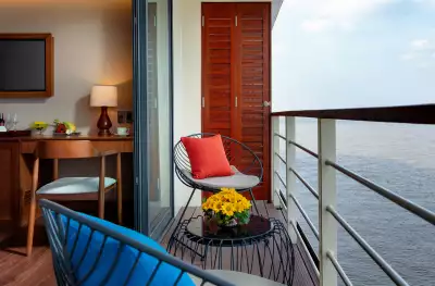 Our Deluxe Staterooms offer comfort and style, featuring large open windows with a private balcony with seating, complimentary bathrobes and slippers.